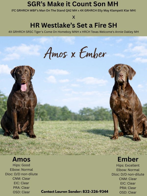 Ember and Amos will produce chocolate pups ready to go any direction- competition in any venue, awesome hunting dogs or working companions. These dogs will be versatile, aim to please, and happy to do any job you’d like. Embers first litter of pups are thriving, hunting and training. This cross with Amos will produce some of the most talented chocolates with an incredible pedigree.